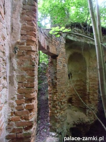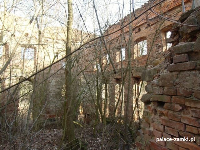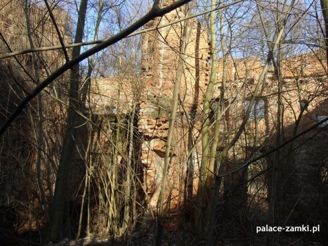 Wysiadając z samochodu trafiliśmy na wielką ścianę dzikiej roślinności. Można powiedzieć, że dzięki zimowej porze roku znaleźliśmy te ruiny. Od strony drogi zza krzaków wyłoniła się zmasakrowana bryła, która jest cieniem dawnego pałacu – widok nie zachwycał, zwykły dom mieszkalny z fosą. Zaczęliśmy szukać wejścia na drugą stronę. Przedzieraliśmy się przez wielkie krzaki, a jak się później okazało, można było wejść innym wejściem- dróżkę tą zasłaniały drzewa i do wybrania jej zniechęcała błotnista polana, przez którą owa dróżka wiodła.