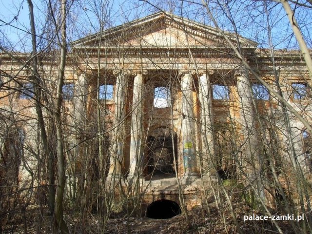 Gdy już dotarliśmy na drugą stronę pałacu, jak się okazało frontową, widok zaparł nam dech w piersiach. Wielki i wspaniały, który ocalał do czasów obecnych, portyk 6 kolumnowy, który świadczy o świetności niegdyś tego ogromnego pałacu. Wygląda to jak rodem z architektury Greckiej.